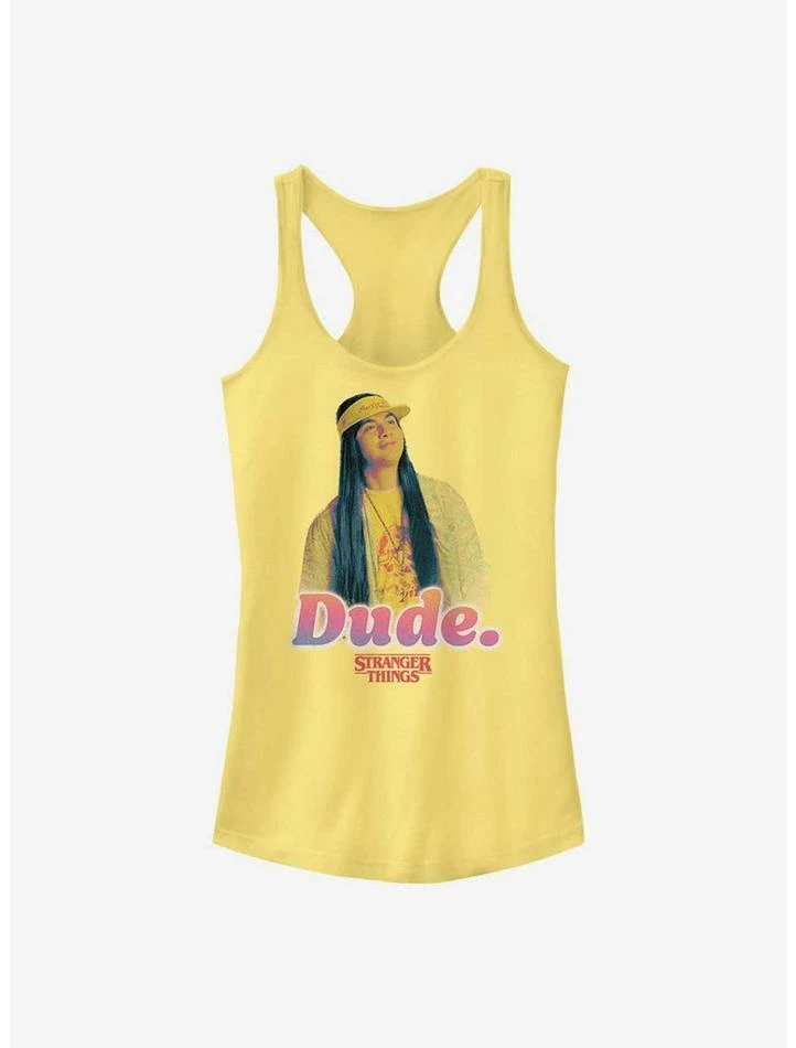 Dude. DUDE! This banana yellow racerback tank — inspired by Stranger Things 4 — features eternally laidback Surfer Boy Pizza delivery dude, Argyle!