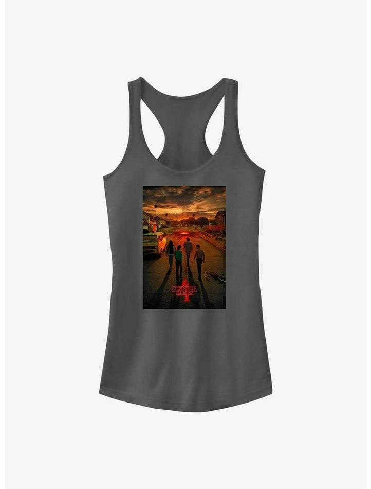 Bye bye Hawkins, hello Lenora Hills! This charcoal grey racerback tank has poster art from Stranger Things 4 — featuring the fictional California town where the Byers and El have settled.