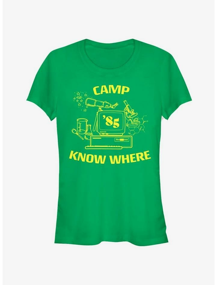 Get ready to join Dustin, Suzie and all your other science-loving friends at summer camp! This fitted, lightweight kelly green Stranger Things tee features a Camp No Where logo with assorted graphics including a vintage ’85 computer, telescope, microscope, and laboratory equipment.