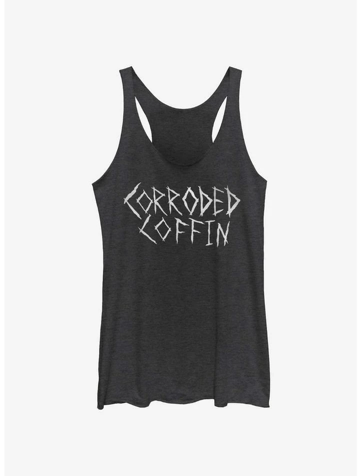 Live at the Hideout, every Tuesday at 10pm! This heather black racerback tank, inspired by Stranger Things 4, features a logo for the best band in Hawkins, Indiana — the band featuring Eddie Munson — Corroded Coffin!