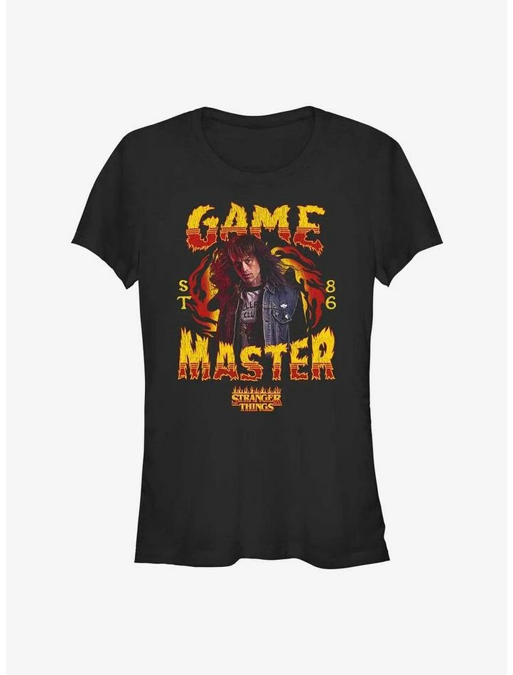 All hail the head of the Hellfire Club! This fitted, lightweight black graphic tee features Eddie Munson, with “Game Master” and “ST 86” verbiage, and a flame-covered Stranger Things logo.