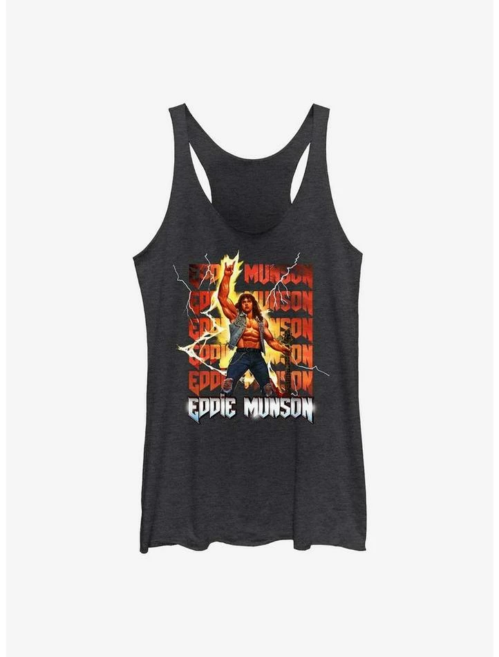 Our heavy metal hero — forever! This heather black racerback tank features Rock God Eddie Munson from Stranger Things 4 holding a guitar and raising the horns.