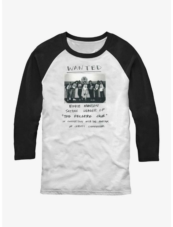 Justice for Eddie! This lightweight black and white raglan — inspired by Stranger Things 4 — features a photo of the Hellfire Club, along with “Wanted” verbiage.
