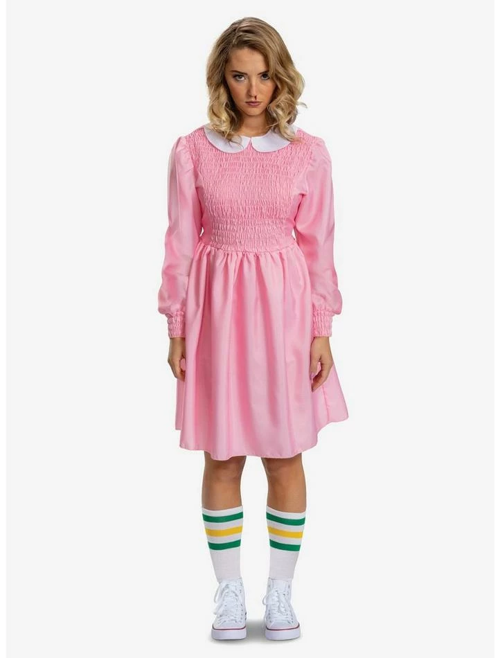 Does anyone else have a sudden hankering for frozen waffles? This blush pink dress from Stranger Things has a white Peter Pan collar with smocked front bodice and back zipper closure.