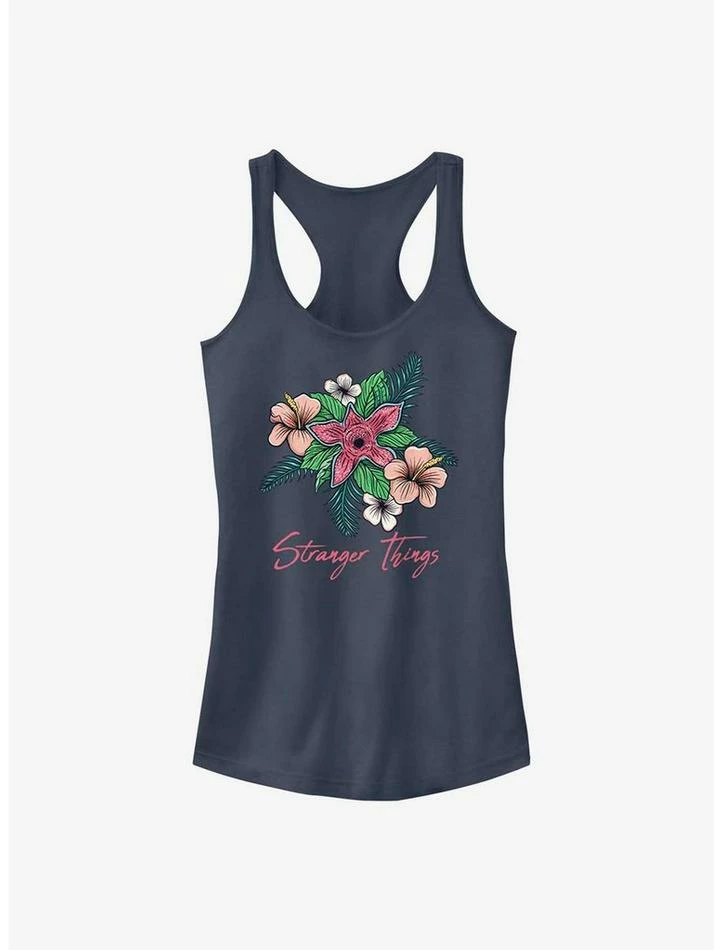 Better nip this one in the bud! Our navy blue racerback Stranger Things tank features a bouquet of hibiscus, palm fronds and… a Demogorgon!