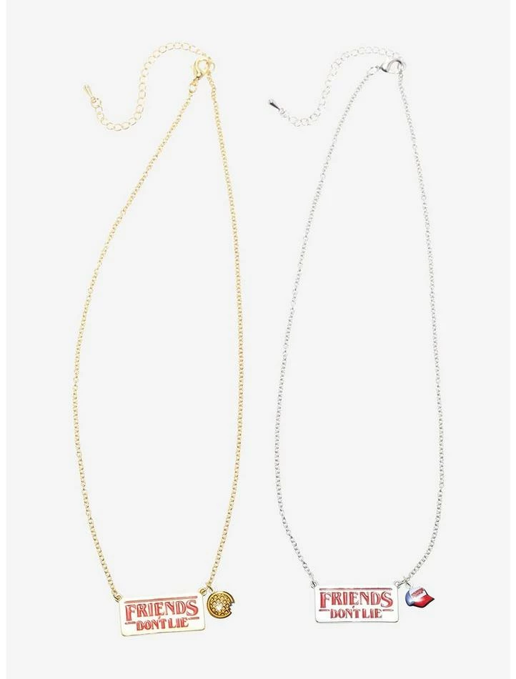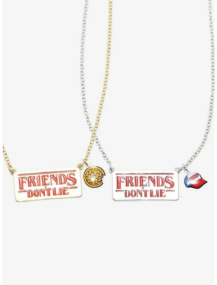 Friends don’t lie, but they do wear matching jewelry! This necklace set from Stranger Things features a gold-tone and a silver-tone chain with “Friends don’t lie” nameplates pendants and waffle and hat charms.