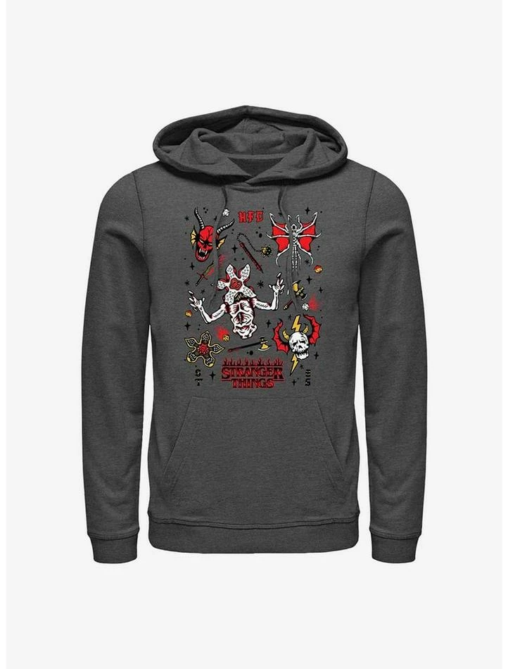 Demogorgons, Demobats and Devils — oh my! This heathered charcoal grey hoodie features iconography known to members of the Hellfire Club — and Stranger Things fans everywhere!