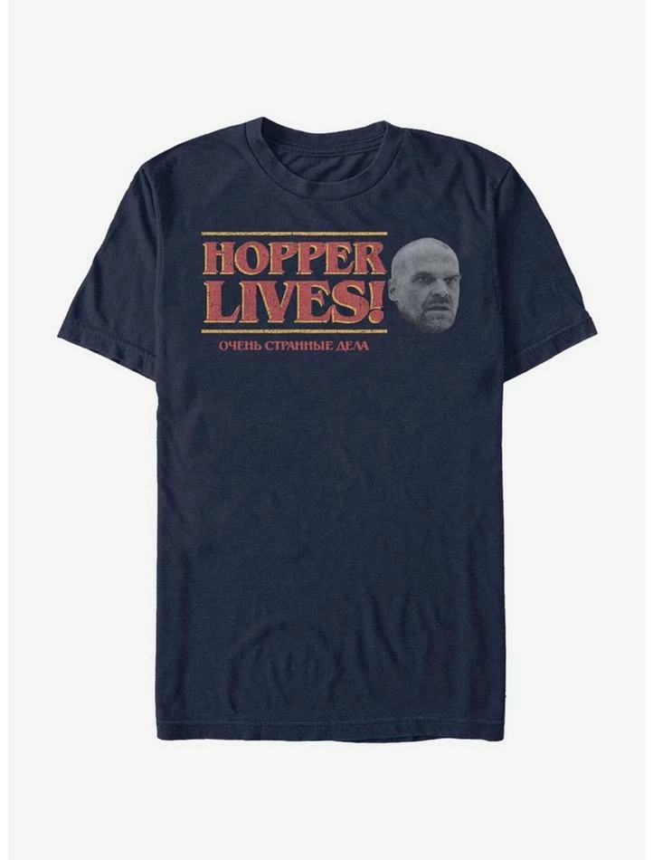 Good news: Hopper’s alive. Bad news: He’s in a Russian prison. Join the quest to save him with this lightweight navy blue Stranger Things 4 tee.