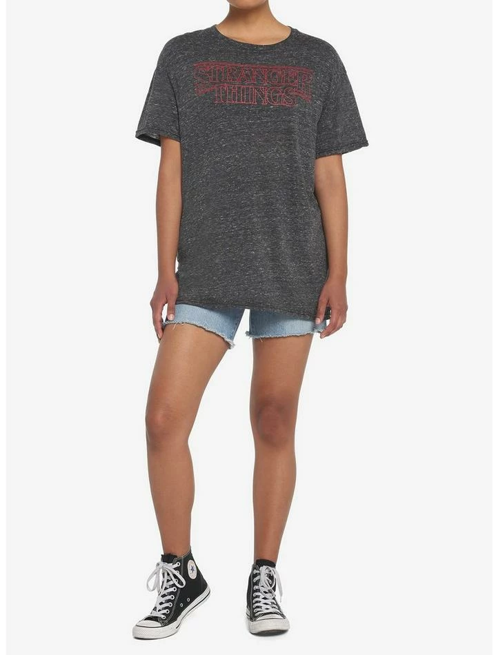 Ready to enter the Upside Down again? Get hyped for the newest season of Stranger ThingsΒ with a brand new tee! This simple speckled top features the show’s logo printed on the chest.