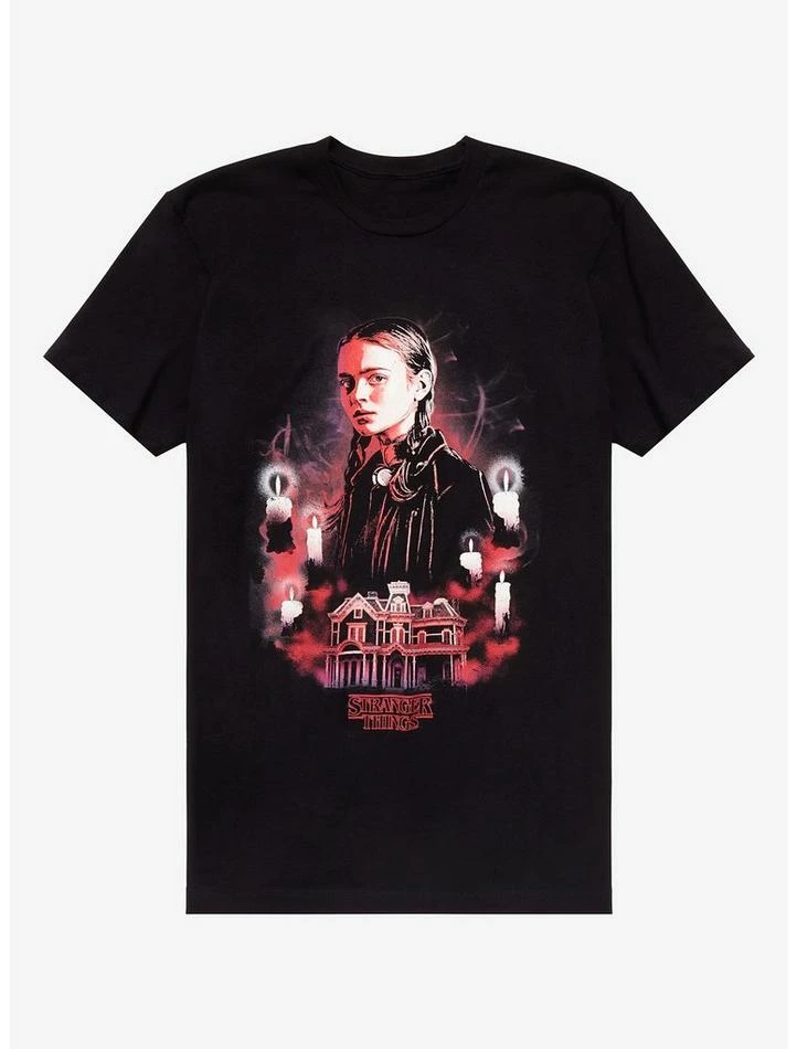 Ready to take down Vecna once and for all? Grab your tunes and this tee to channel some of Max’s fearless energy! Rep Stranger ThingsΒ with this tonal top, featuring the ominous Creel House and a large portrait of Max Mayfield up top, with candles and fog surrounding her.