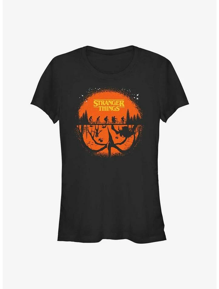 The perfect Stranger Things shirt to turn your world upside down. (Wink.) This fitted, lightweight black graphic tee has an orange circle design featuring the gang riding bikes at night up top — and the mind flayer, a demogorgon and more below.