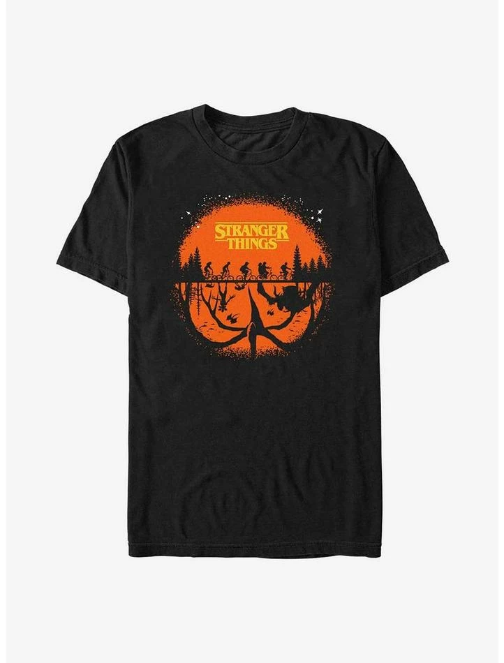 The perfect Stranger Things shirt to turn your world upside down. (Wink.) This lightweight black graphic tee has an orange circle design featuring the gang riding bikes at night up top — and the mind flayer, a demogorgon and more below.