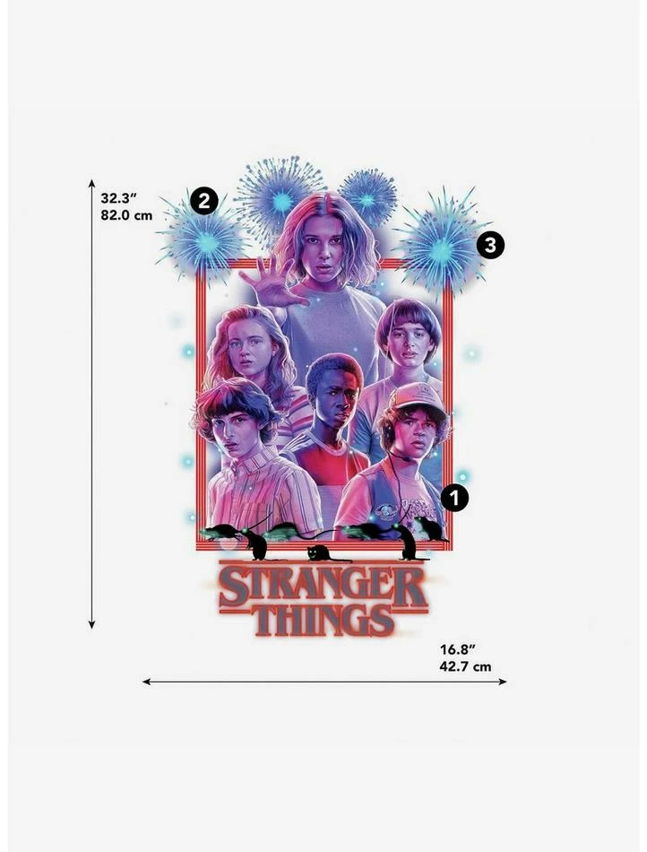 Netflix’s fans of fictional town, Hawkins IN, will love to surround themselves with this collage of Eleven, Dustin, Lucas, Max, Mike, and Will featured in the Stranger Things peel and stick giant wall decal Choose the focal point in any youth’s bedroom, media room or family room and easily create a big statement with this officially licensed giant decal. This is truly the perfect piece of wall art for any fan of the blockbuster show. Wall decals are an easy and affordable way to decorate in minutes. Reposition or remove them effortlessly with no remaining sticky residue or damage to walls.
