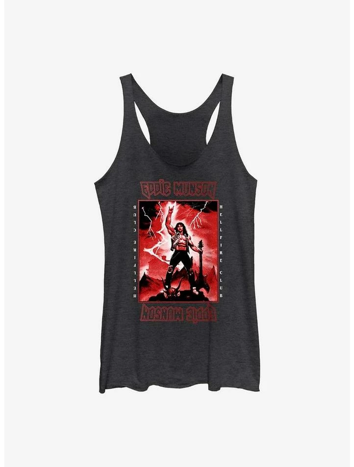 The hero we deserve! This heather black racerback tank features demobat distractor and headbanging head of the Hellfire Club — Eddie Munson from Stranger Things 4.