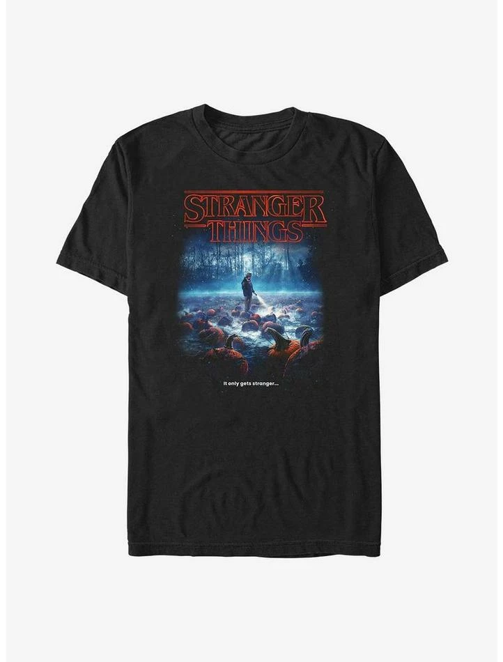 Did Eugene poison the pumpkins on Merrill’s farm? Hopper’s on the case! This lightweight black tee — inspired by Stranger Things 2 — features a series logo above an image of Jim Hopper investigating Merrill’s Pumpkin Patch, with “It only gets stranger…” verbiage below.