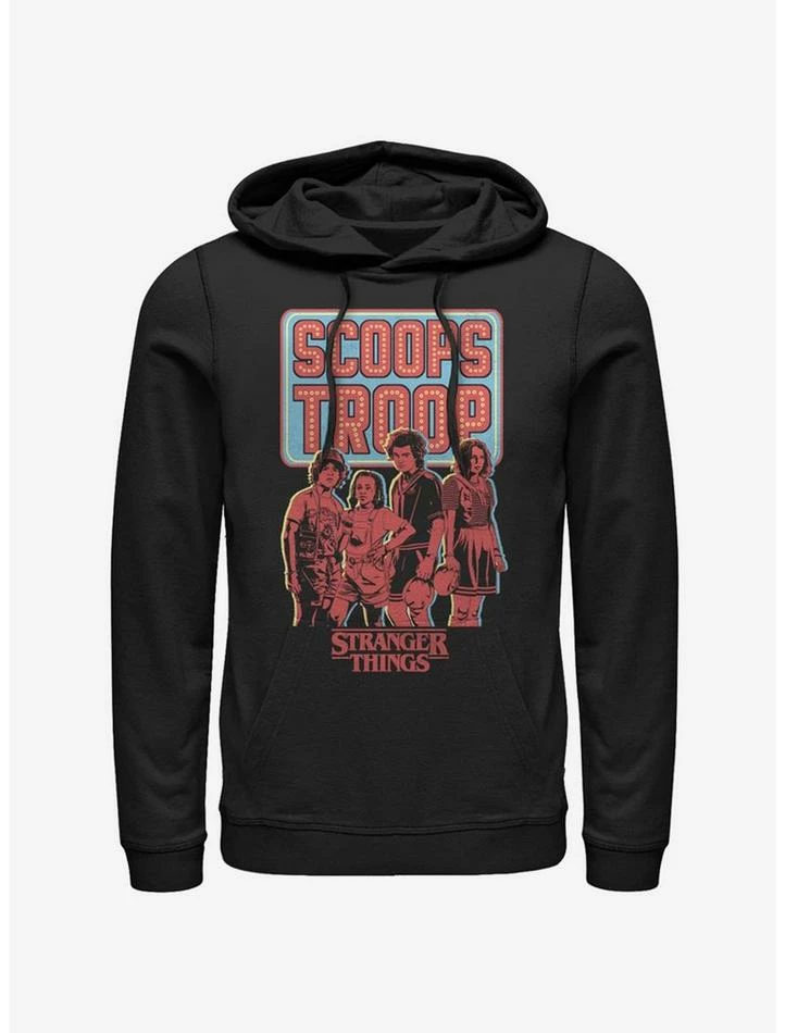 Some people will do anything to get free ice cream for life. This black Stranger Things hoodie features your Scoops Troop — Dustin, Erica, Steve and Robin — in red.