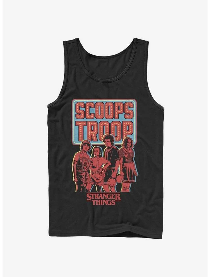 Some people will do anything to get free ice cream for life. This black Stranger Things tank features your Scoops Troop — Dustin, Erica, Steve and Robin — in red.