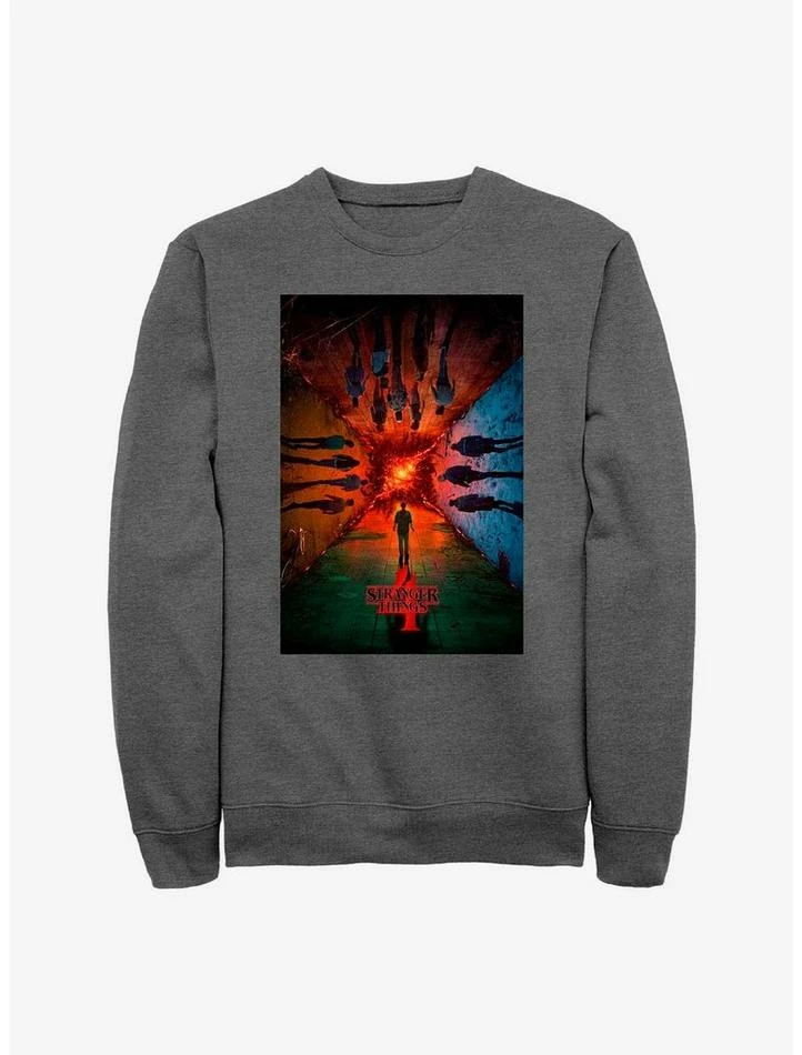 Every ending has a beginning. Return to the Upside Down with this heathered charcoal grey crew that features ominous poster art from Stranger Things 4.