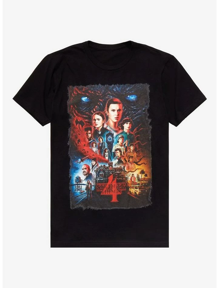 Β Do you hear a grandfather clock going off, or is that just us? Rock this Stranger ThingsΒ tee while taking down Vecna with the Hawkins gang! This poster top features all the main characters from the show, with Vecna looming in the background and the show’s title at the bottom.
