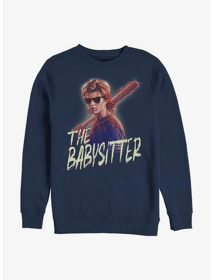 Never underestimate the power of a nice guy wielding a nail-covered baseball bat. This navy blue crewneck Stranger Things sweatshirt — which is oh-so-soft and comfy — features your babysitting hero, Steve Harrington.