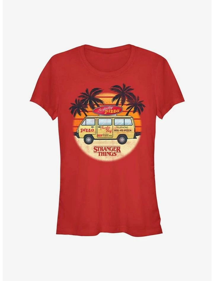 This fitted, lightweight red tee features a Surfer Boy Pizza delivery van parked amongst the palm trees. A red Stranger Things logo sits below.
