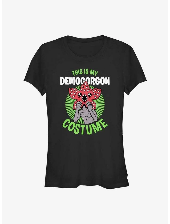 No tricks, just treats! This fitted, lightweight black graphic tee — inspired by Stranger Things — features a surprised demogorgon along with “This is my demogorgon costume” verbiage.