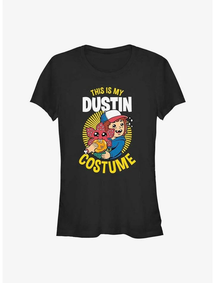 No tricks, just treats! This fitted, lightweight black graphic tee — inspired by Stranger Things — features Dustin Henderson holding infant demogorgon Dart along with “This is my Dustin costume” verbiage.