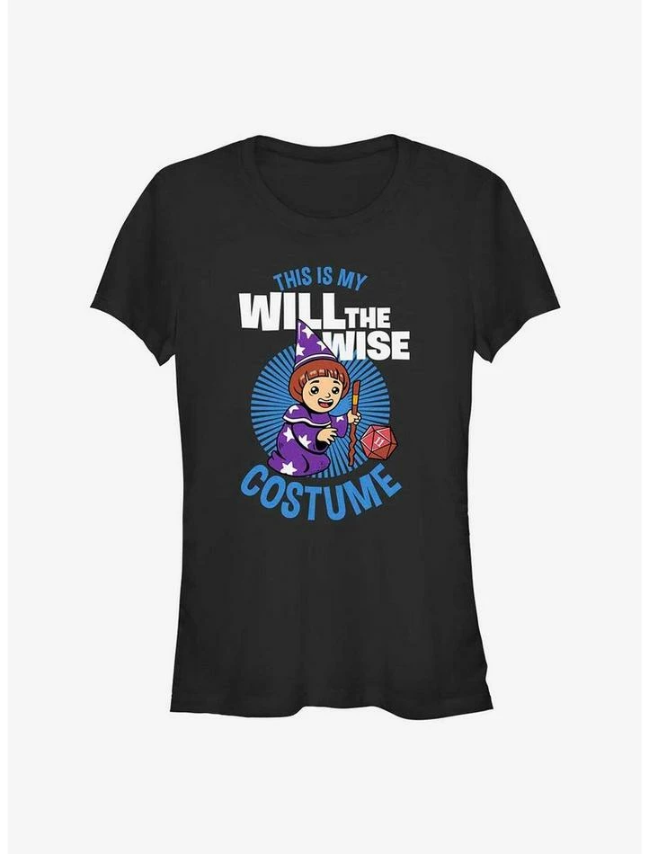 No tricks, just treats! This fitted, lightweight black graphic tee — inspired by Stranger Things — features D&D-playing Will Byers along with “This is my Will the Wise costume” verbiage.