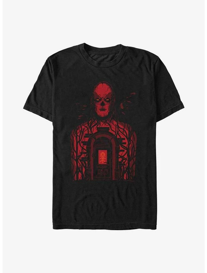 Knock, knock. Who’s there? Venca, that’s who! The Stranger Things 4 villain appears above a door on this lightweight black graphic tee.