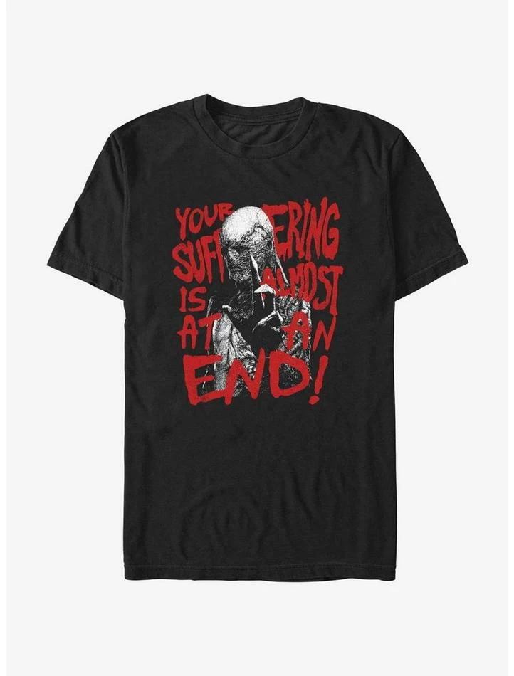 This lightweight black T-shirt — inspired by Stranger Things 4 — features Vecna surrounded by “Your suffering is almost at an end!” verbiage.